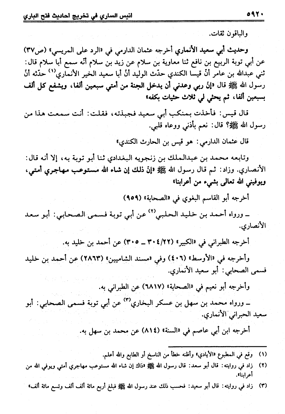 وتابعه محمد بن عبد الملك بن زنجويه البغدادي ثنا أبو توبة به، إلا أنه قال: الأنصاري. وزاد: ثم قال رسول الله -صلى الله عليه وسلم- "إنّ ذلك إن شاء الله مستوعب مهاجري أمتي، ويوفيني الله تعالى بشيء من أعرابنا"