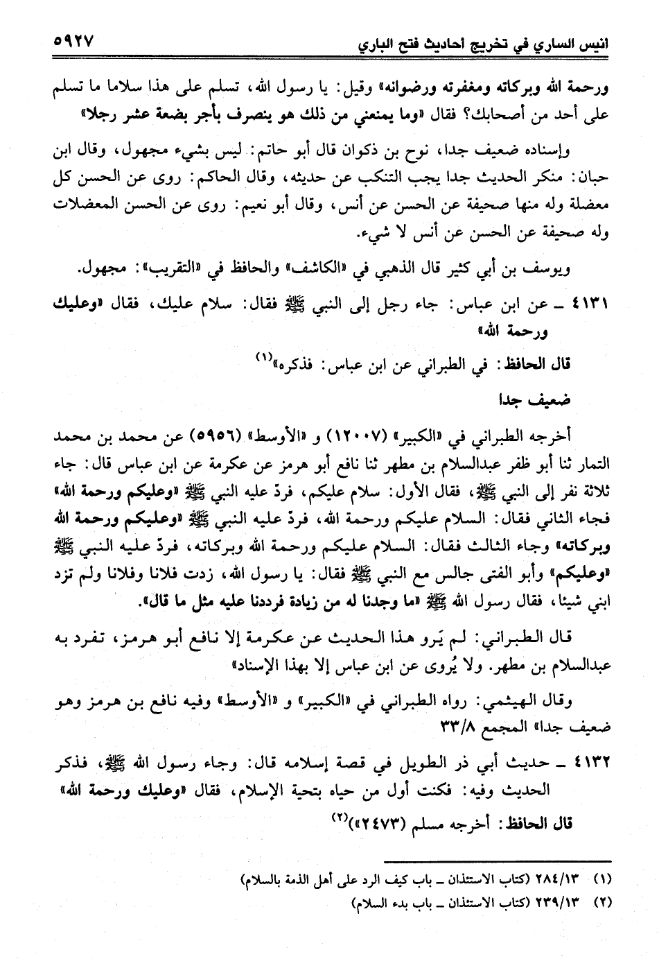 4131 - عن ابن عباس: جاء رجل إلى النبي-صلى الله عليه وسلم- فقال: سلام عليك، فقال "وعليك ورحمة الله"