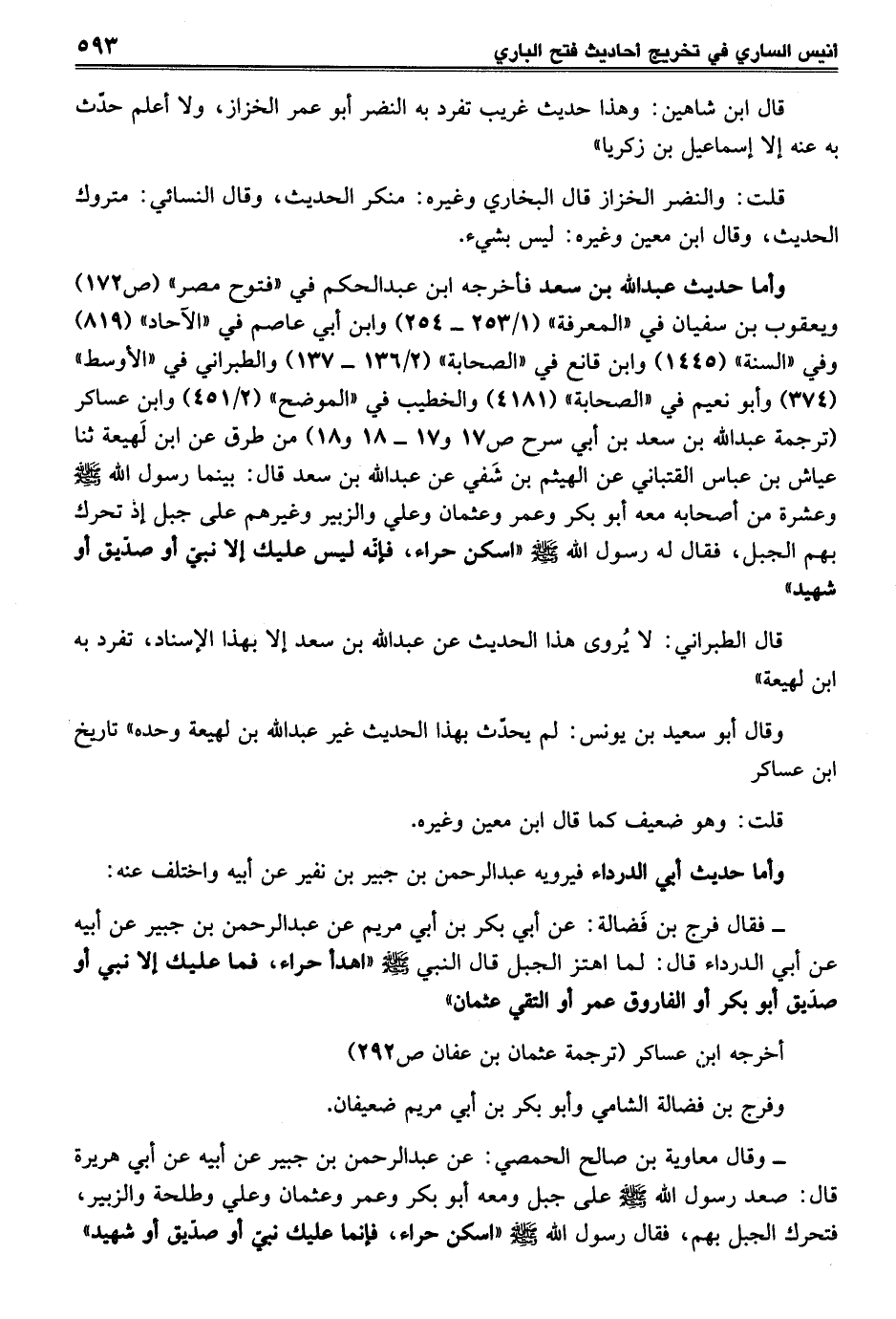 وأما حديث عبد الله بن سعد فأخرجه ابن عبد الحكم في "فتوح مصر" (ص 172) ويعقوب بن سفيان في "المعرفة" (1/ 253 - 254) وابن أبي عاصم في "الآحاد" (819) وفي "السنة" (1445) وابن قانع في "الصحابة" (2/ 136 - 137) والطبراني في "الأوسط" (374) وأبو نعيم في "الصحابة" (4181) والخطيب في "الموضح" (2/ 451) وابن عساكر (ترجمة عبد الله بن سعد بن أبي سرح ص 17 و 17 - 18 و 18) من طرق عن ابن لَهيعة ثنا عياش بن عباس القتباني عن الهيثم بن شَفي عن عبد الله بن سعد قال: بينما رسول الله - صلى الله عليه وسلم - وعشرة من أصحابه معه أبو بكر وعمر وعثمان وعلي والزبير وغيرهم على جبل إذ تحرك بهم الجبل، فقال له رسول الله - صلى الله عليه وسلم - "اسكن حراء، فإنّه ليس عليك إلا نبيّ أو صدّيق أو شهيد"