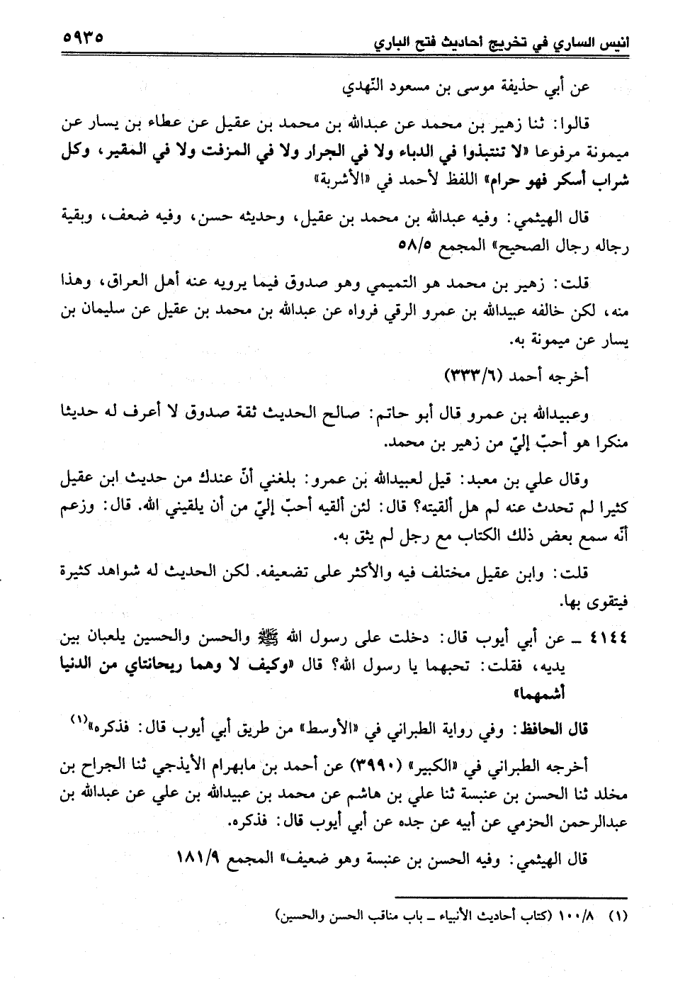 قالوا: ثنا زهير بن محمد عن عبد الله بن محمد بن عقيل عن عطاء بن يسار عن ميمونة مرفوعا "لا تنتبذوا في الدباء ولا في الجرار ولا في المزفت ولا في المقير، وكل شراب أسكر فهو حرام" اللفظ لأحمد في "الأشربة"