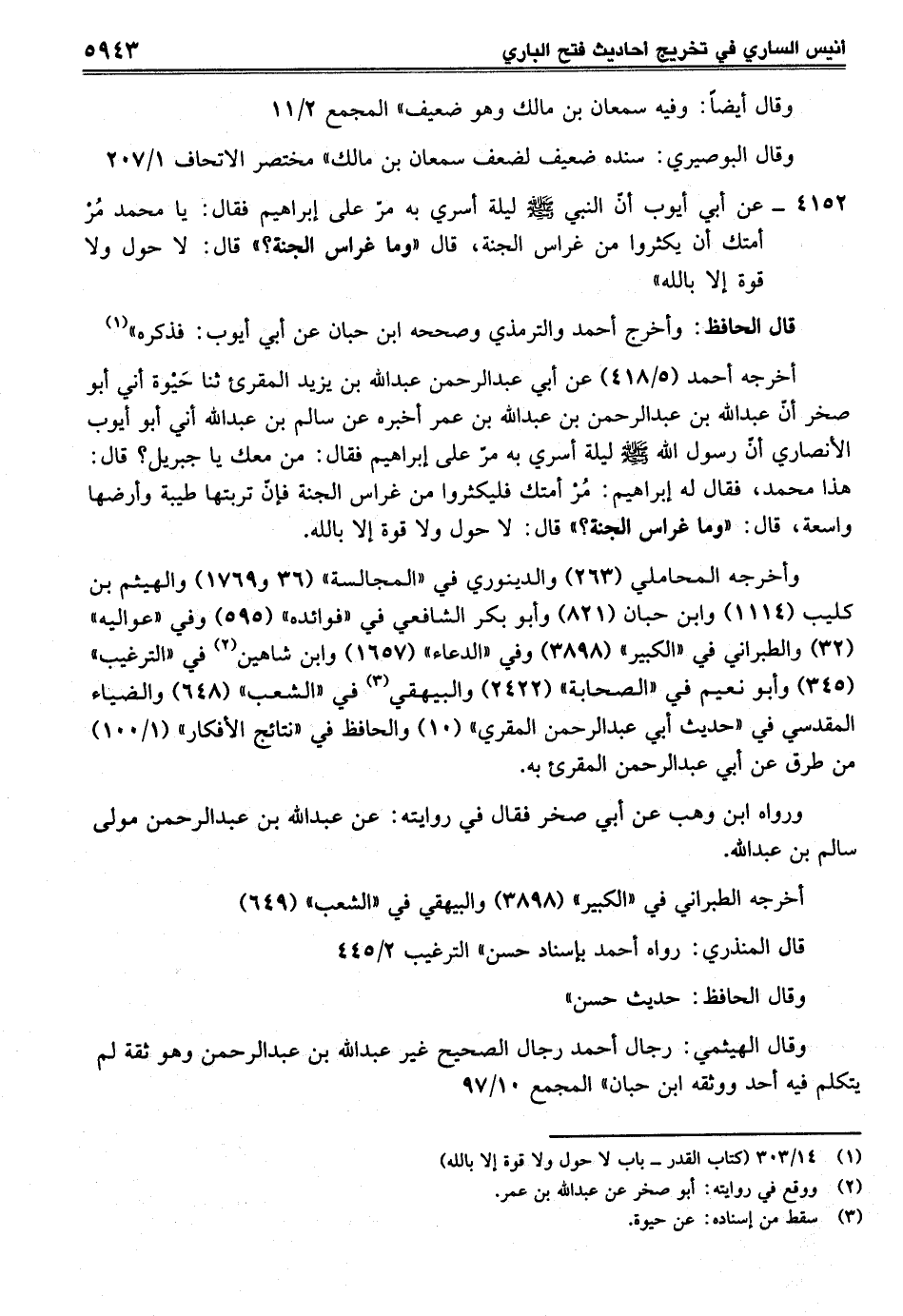 4152 - عن أبي أيوب أنّ النبي-صلى الله عليه وسلم- ليلة أسري به مرّ على إبراهيم فقال: يا محمد مُرْ أمتك أن يكثروا من غراس الجنة، قال "وما غراس الجنة؟ " قال: لا حول ولا قوة إلا بالله"
