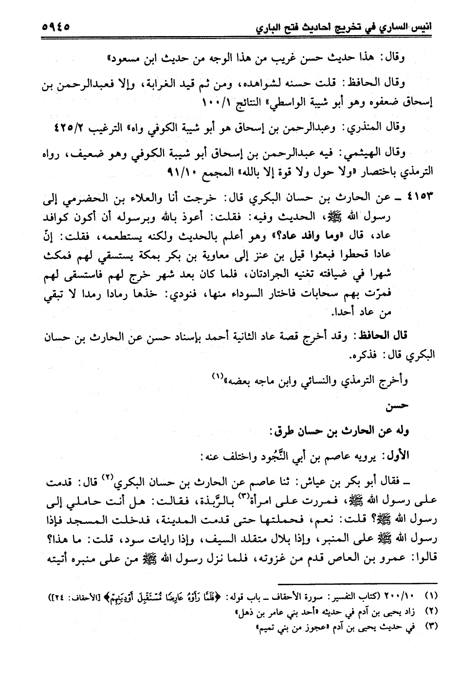 قال الحافظ: وقد أخرج قصة عاد الثانية أحمد بإسناد حسن عن الحارث بن حسان البكري قال: فذكره.