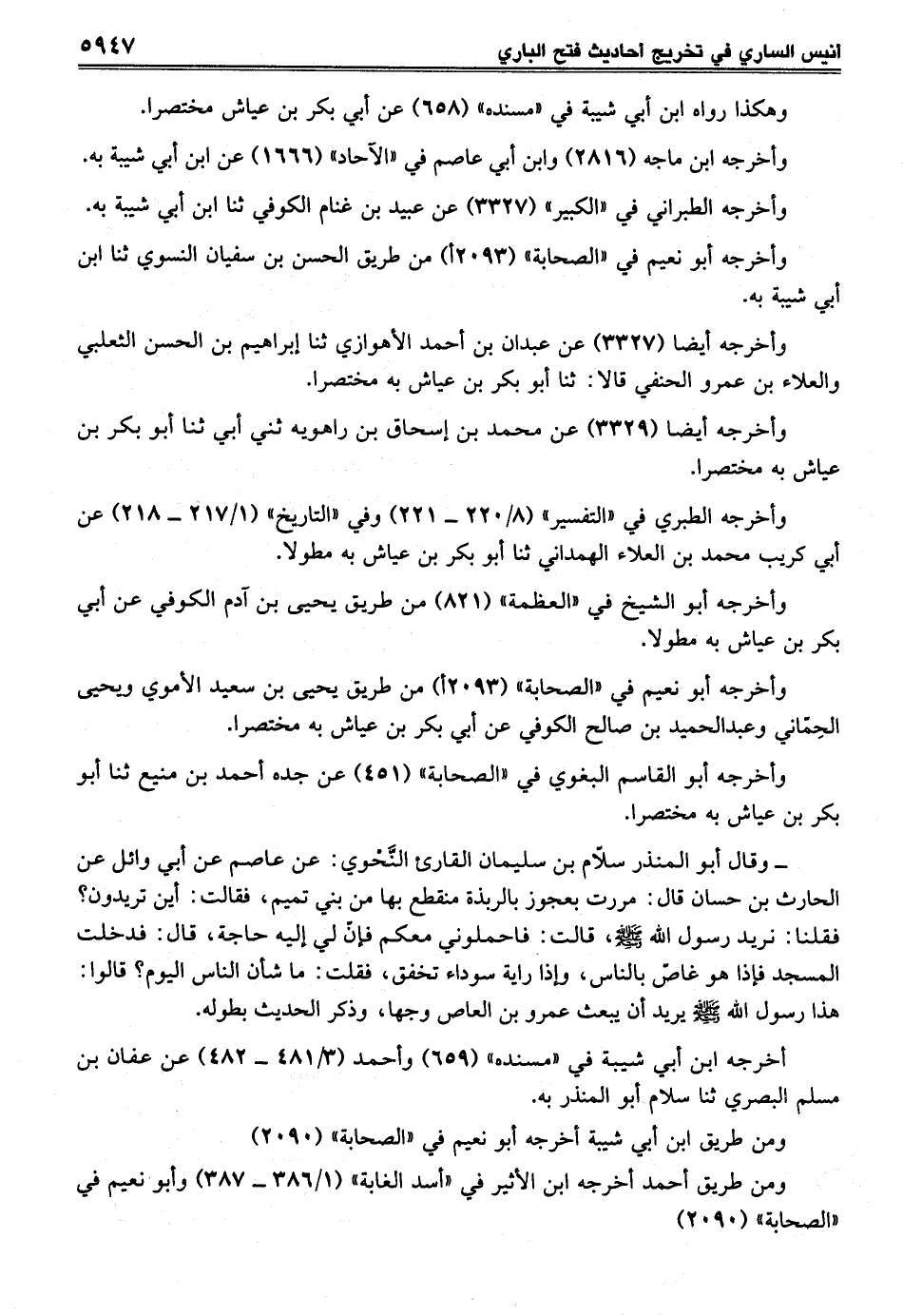 - وقال أبو المنذر سلاّم بن سليمان القارئ النَّحْوي: عن عاصم عن أبي وائل عن الحارث بن حسان قال: مررت بعجوز بالربذة منقطع بها من بني تميم، فقالت: أين تريدون؟ فقلنا: نريد رسول الله -صلى الله عليه وسلم-، قالت: فاحملوني معكم فإنّ لي إليه حاجة، قال: فدخلت المسجد فإذا هو غاصّ بالناس، وإذا راية سوداء تخفق، فقلت: ما شأن الناس اليوم؟ قالوا: هذا رسول الله -صلى الله عليه وسلم- يريد أن يبعث عمرو بن العاص وجهًا، وذكر الحديث بطوله.