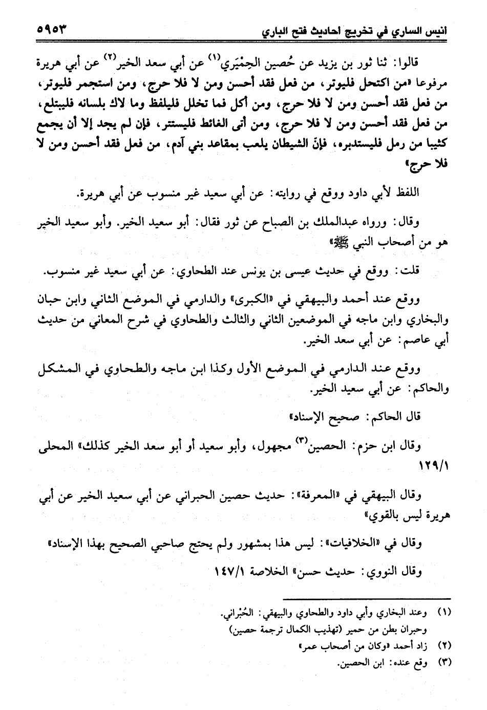 وقال ابن حزم: الحصين (¬3) مجهول، وأبو سعيد أو أبو سعد الخير كذلك" المحلى 1/ 129