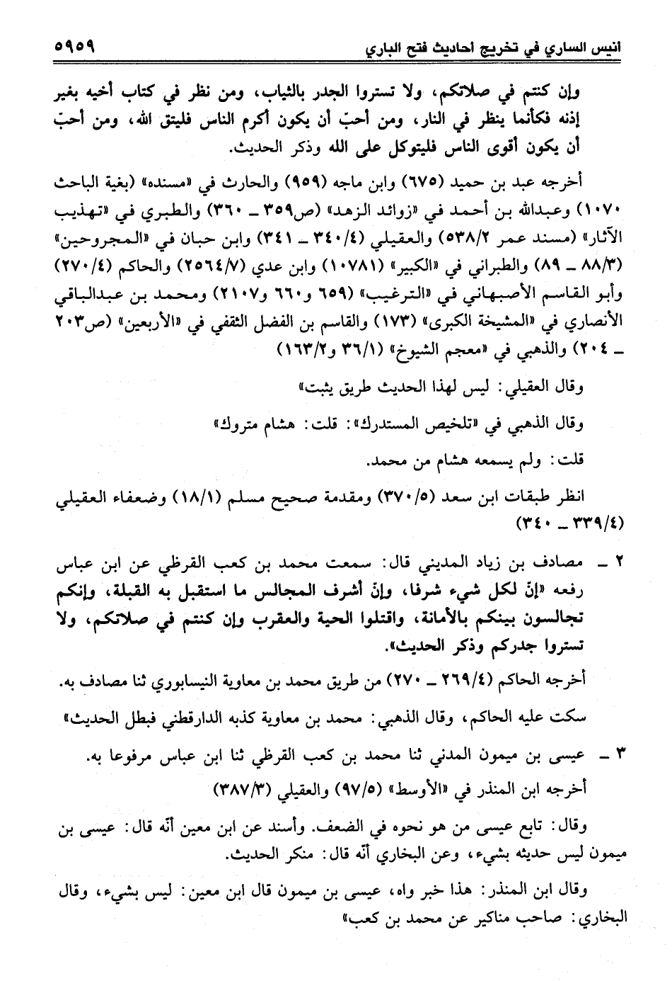 2 - مصادف بن زياد المديني قال: سمعت محمد بن كعب القرظي عن ابن عباس رفعه "إنّ لكل شيء شرفا، وإنّ أشرف المجالس ما استقبل به القبلة، وإنكم تجالسون بينكم بالأمانة، واقتلوا الحية والعقرب وإن كنتم في صلاتكم، ولا تستروا جدركم وذكر الحديث".