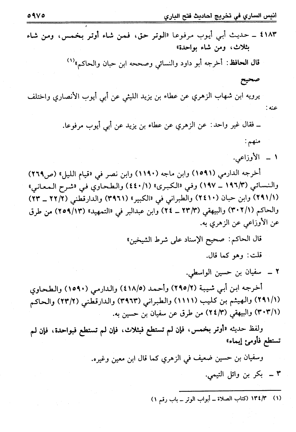 4183 - حديث أبي أيوب مرفوعا "الوتر حق، فمن شاء أوتر بخمس، ومن شاء بثلاث، ومن شاء بواحدة"