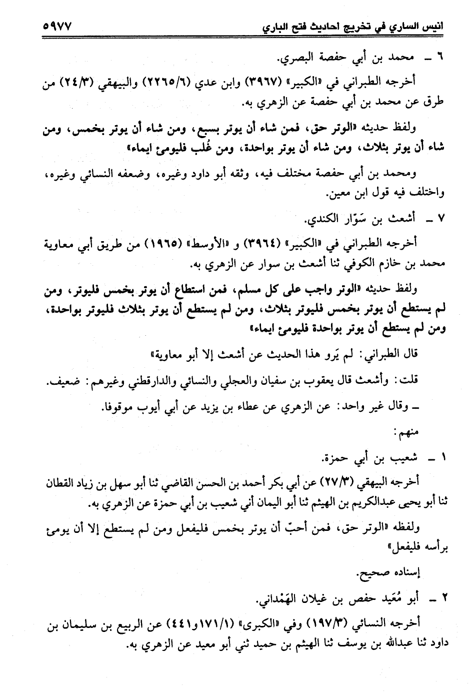 ولفظ حديثه "الوتر واجب على كل مسلم، فمن استطاع أن يوتر بخمس فليوتر، ومن لم يستطع أن يوتر بخمس فليوتر بثلاث، ومن لم يستطع أن يوتر بثلاث فليوتر بواحدة، ومن لم يستطع أن يوتر بواحدة فليومئ ايماء"