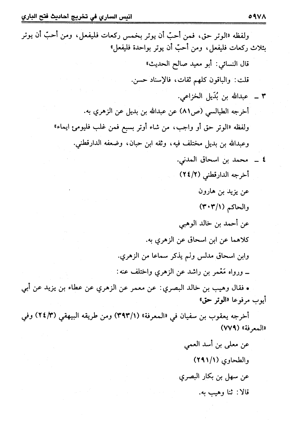 • فقال وهيب بن خالد البصري: عن معمر عن الزهري عن عطاء بن يزيد عن أبي أيوب مرفوعا "الوتر حق"