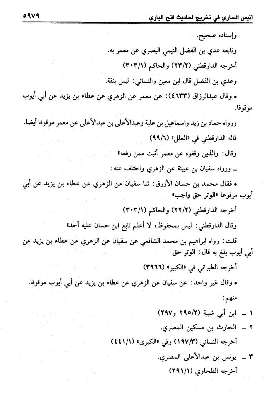 • فقال محمد بن حسان الأزرق: ثنا سفيان عن الزهري عن عطاء بن يزيد عن أبي أيوب مرفوعا "الوتر حق واجب"