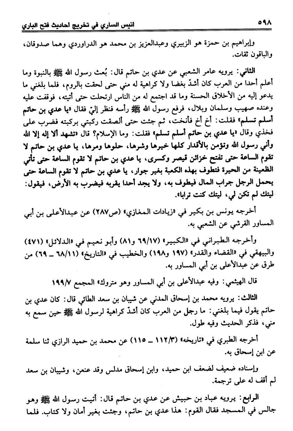الثاني: يرويه عامر الشعبي عن عدي بن حاتم قال: بُعث رسول الله - صلى الله عليه وسلم - بالنبوة وما أعلم أحدا من العرب كان أشدّ بغضا ولا كراهية له مني حتى لحقت بالروم، فلما بلغني ما يدعو إليه من الأخلاق الحسنة وما قد اجتمع له من الناس ارتحلت حتى أتيته، فوقفت عليه وعنده صهيب وسلمان وبلال، فرفع رسول الله - صلى الله عليه وسلم - رأسه فنظر إليّ فقال "يا عدي بن حاتم أسلم تسلم" فقلت: أخ أخ فأنخت، ثم جئت حتى ألصقت ركبتي بركبته فضرب على فخذي وقال "يا عدي بن حاتم أسلم تسلم" فقلت: وما الإِسلام؟ قال "تشهد ألا إله إلا الله وأني رسول الله وتؤمن بالأقدار كلها خيرها وشرها، حلوها ومرها، يا عدي بن حاتم لا تقوم الساعة حتى تفتح خزائن قيصر وكسرى، يا عدي بن حاتم لا تقوم الساعة حتى تأتي الظعينة من الحيرة فتطوف بهذه الكعبة بغير جوار، يا عدي بن حاتم لا تقوم الساعة حتى يحمل الرجل جراب المال فيطوف به، ولا يجد أحدا يقربه فيضرب به الأرض، فيقول: ليتك لم تكن لي، ليتك كنت ترابا".
