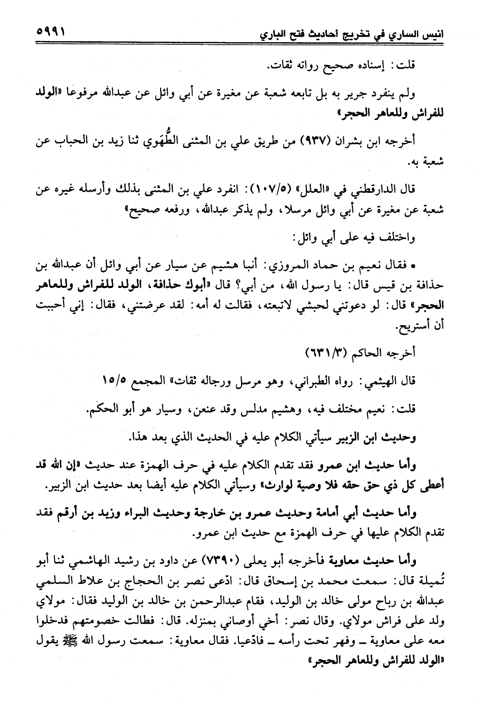 • فقال نعيم بن حماد المروزي: أنبأ هشيم عن سيار عن أبي وائل أن عبد الله بن حذافة بن قيس قال: يا رسول الله، من أبي؟ قال "أبوك حذافة، الولد للفراش وللعاهر الحجر" قال: لو دعوتني لحبشي لاتبعته، فقالت له أمه: لقد عرضتني، فقال: إني أحببت أن أستريح.