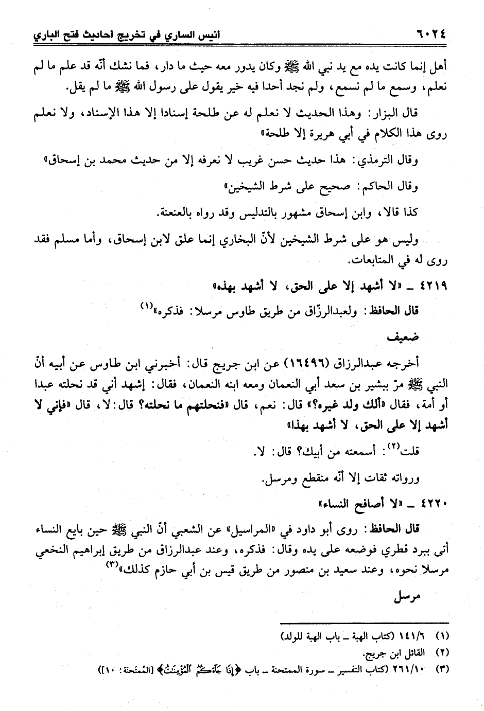 أخرجه عبد الرزاق (16496) عن ابن جريج قال: أخبرني ابن طاوس عن أبيه أنّ النبي-صلى الله عليه وسلم- مرّ ببشير بن سعد أبي النعمان ومعه ابنه النعمان، فقال: إشهد أني قد نحلته عبدا أو أمة، فقال "ألك ولد غيره؟ " قال: نعم، قال "فنحلتهم ما نحلته؟ قال: لا، قال "فإني لا أشهد إلا على الحق، لا أشهد بهذا"