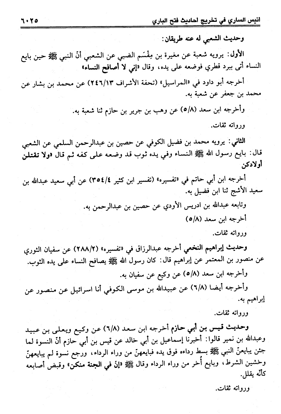 الأول: يرويه شعبة عن مغيرة بن مِقْسَم الضبي عن الشعبي أنّ النبي-صلى الله عليه وسلم-حين بايع النساء أتى ببرد قطري فوضعه على يده، وقال "إني لا أصافح النساء"