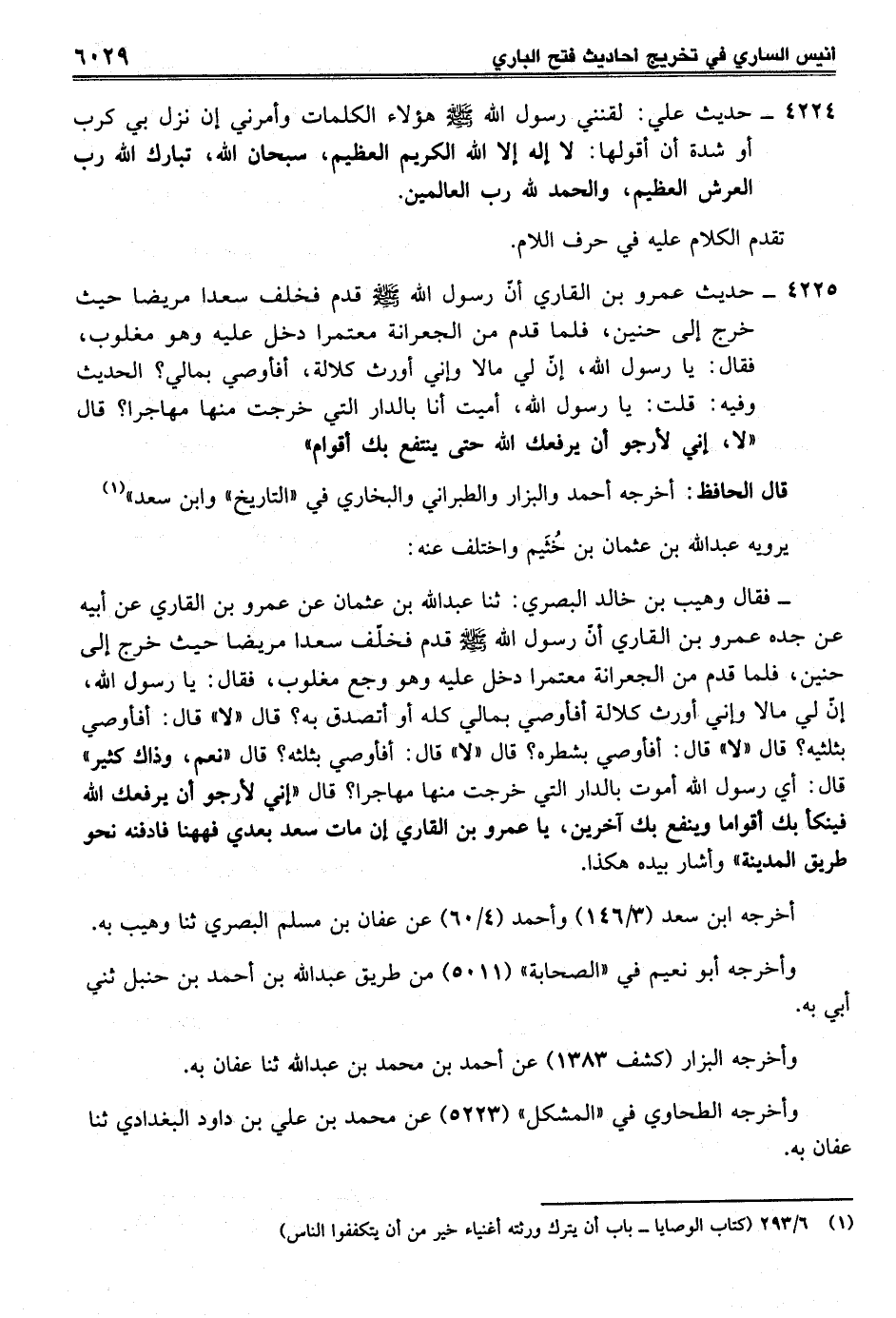 4225 - حديث عمرو بن القاري أنّ رسول الله -صلى الله عليه وسلم- قدم فخلف سعدا مريضا حيث خرج إلى حنين، فلما قدم من الجعرانة معتمرا دخل عليه وهو مغلوب، فقال: يا رسول الله، إنّ لي مالًا وإني أورث كلالة، أفأوصي بمالي؟ الحديث وفيه: قلت: يا رسول الله، أميت أنا بالدار التي خرجت منها مهاجرا؟ قال "لا، إني لأرجو أن يرفعك الله حتى ينتفع بك أقوام"