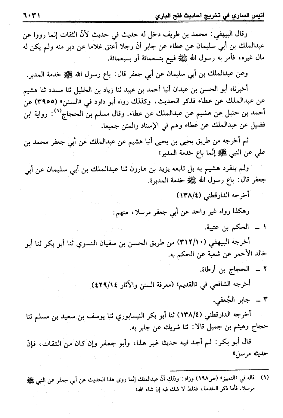 ثم أخرجه من طريق يحيى بن يحيى أنبأ هشيم عن عبد الملك عن أبي جعفر محمد بن علي عن النبي-صلى الله عليه وسلم- إنّما باع خدمة المدبر"