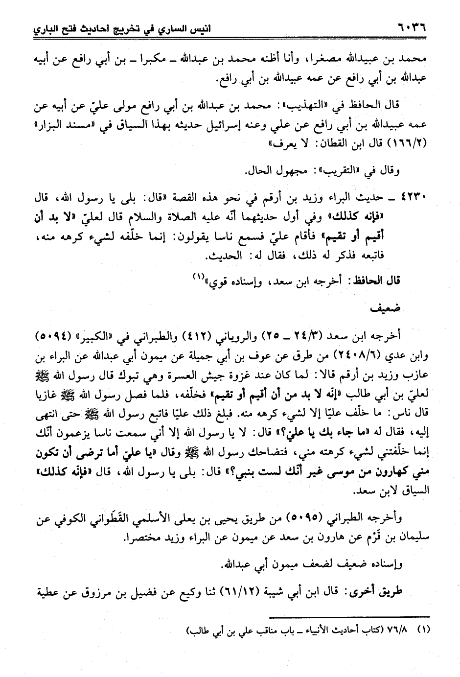 4230 - حديث البراء وزيد بن أرقم في نحو هذه القصة "قال: بلى يا رسول الله، قال "فإنه كذلك" وفي أول حديثهما أنّه عليه الصلاة والسلام قال لعليّ "لا بد أن أقيم أو تقيم" فأقام عليّ فسمع ناسا يقولون: إنما خلّفه لشيء كرهه منه، فأتبعه فذكر له ذلك، فقال له: الحديث.