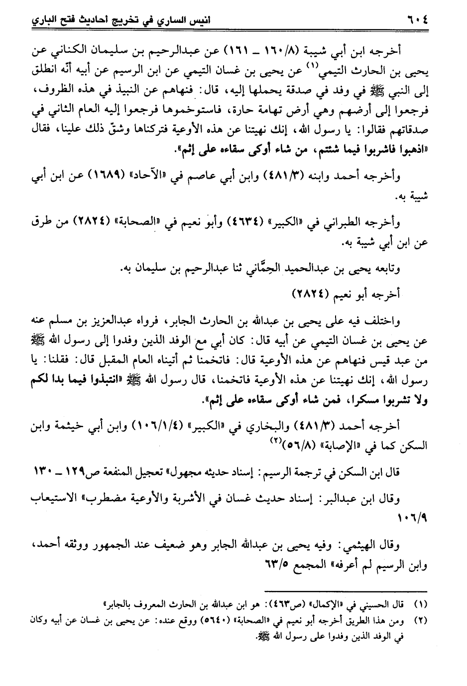 أخرجه ابن أبي شيبة (8/ 160 - 161) عن عبد الرحيم بن سليمان الكناني عن يحيى بن الحارث التيمي (¬1) عن يحيى بن غسان التيمي عن ابن الرسيم عن أبيه أنّه انطلق إلى النبي - صلى الله عليه وسلم - في وفد في صدقة يحملها إليه، قال: فنهاهم عن النبيذ في هذه الظروف، فرجعوا إلى أرضهم وهي أرض تهامة حارة، فاستوخموها فرجعوا إليه العام الثاني في صدقاتهم فقالوا: يا رسول الله، إنك نهيتنا عن هذه الأوعية فتركناها وشق ذلك علينا، فقال "اذهبوا فاشربوا فيما شئتم، من شاء أوكى سقاءه على إثم".