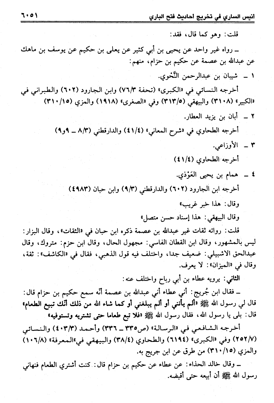 - فقال ابن جُريج: أني عطاء أني عبد الله بن عصمة أنّه سمع حكيم بن حزام قال: قال لي رسول الله -صلى الله عليه وسلم- "ألم يأتني أو ألم يبلغني أو كما شاء الله من ذلك أنّك تبيع الطعام" قال: بلى يا رسول الله، فقال رسول الله -صلى الله عليه وسلم- فلا تبع طعاما حتى تشتريه وتستوفيه"