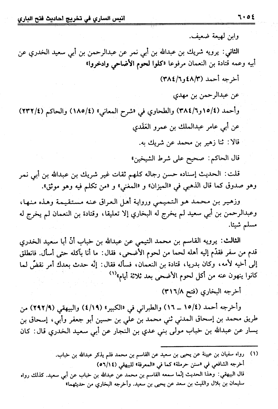 الثالث: يرويه القاسم بن محمد التيمي عن عبد الله بن خباب أنّ أبا سعيد الخدري قدم من سفر فقدّم إليه أهله لحمًا من لحوم الأضحى، فقال: ما أنا بآكله حتى أسأل. فانطلق إلى أخيه لأمه، وكان بدريا، قتادة بن النعمان، فسأله فقال: إنّه حدث بعدك أمر نقضٌ لما كانوا ينهون عنه من أكل لحوم الأضحى بعد ثلاثة أيام" (¬1)
