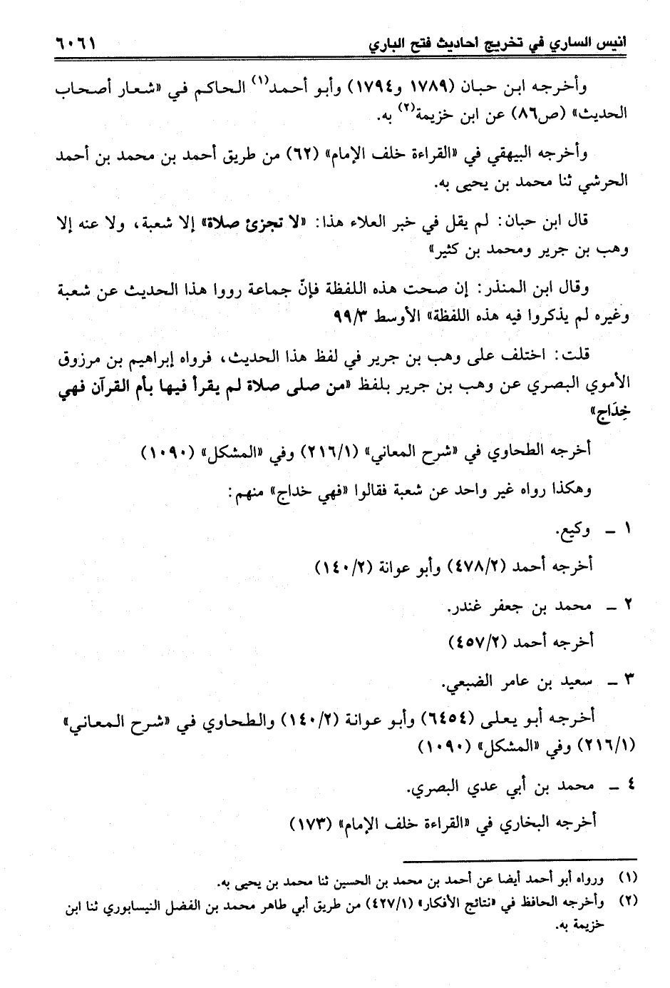 قال ابن حبان: لم يقل في خبر العلاء هذا: "لا تجزئ صلاة" إلا شعبة، ولا عنه إلا وهب بن جرير ومحمد بن كثير"