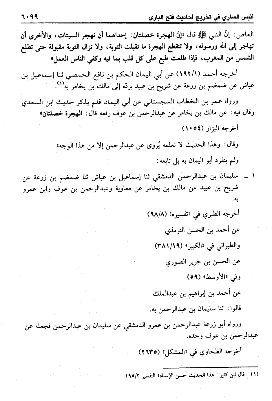 ورواه عمر بن الخطّاب السجستاني عن أبي اليمان فلم يذكر حديث ابن السعدي وقال فيه: عن مالك بن يخامر عن عبد الرحمن بن عوف رفعه قال: الهجرة خصلتان"
