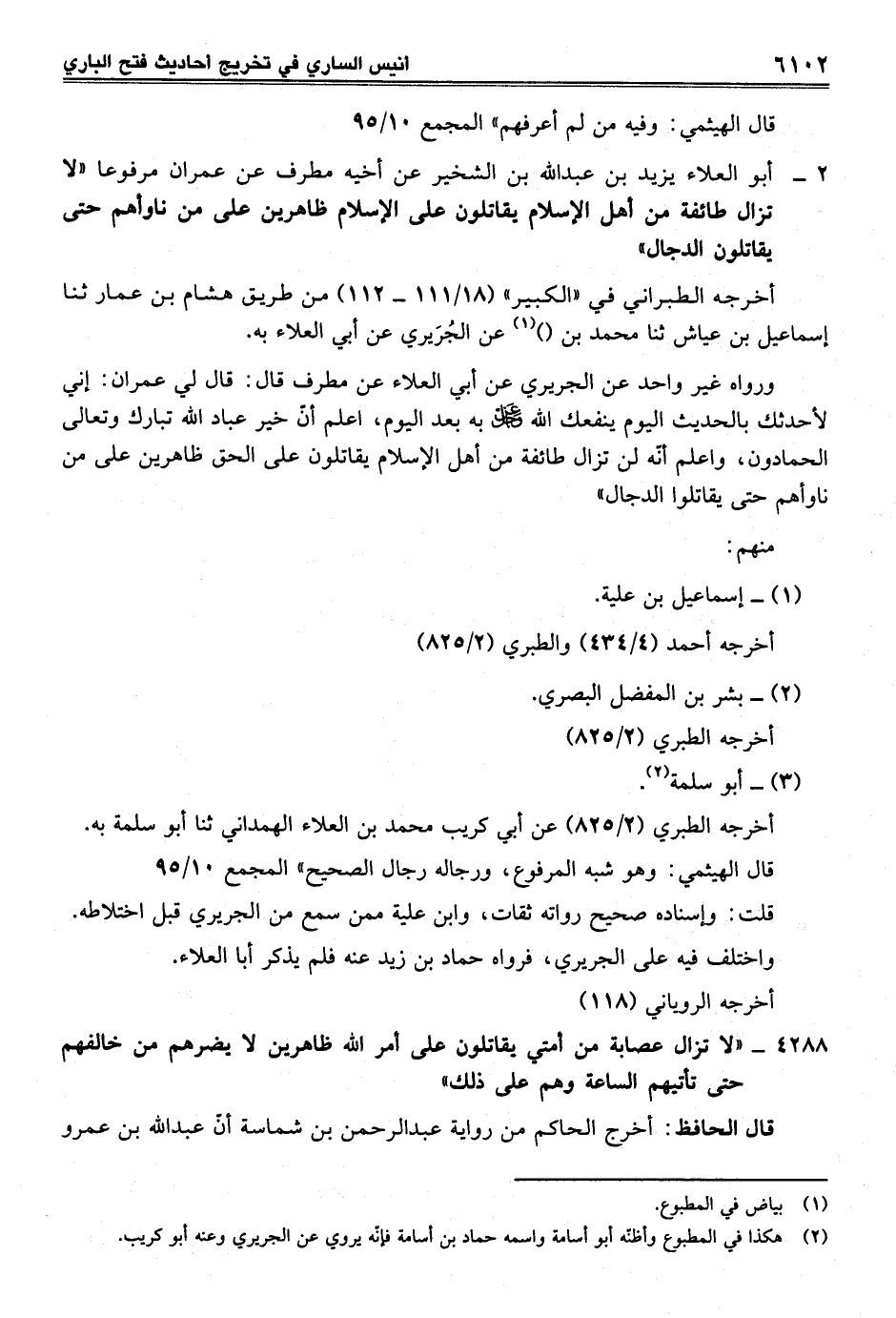 2 - أبو العلاء يزيد بن عبد الله بن الشخير عن أخيه مطرف عن عمران مرفوعا "لا تزال طائفة من أهل الإسلام يقاتلون على الإسلام ظاهرين علي من ناوأهم حتى يقاتلون الدجال"