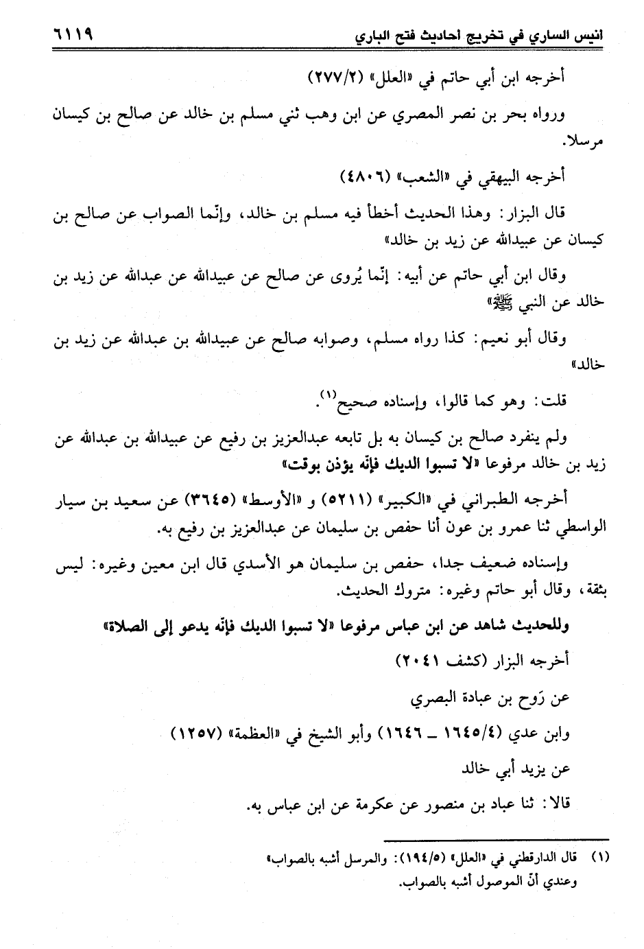 وقال ابن أبي حاتم عن أبيه: إنّما يُروى عن صالح عن عبيد الله عن عبد الله عن زيد بن خالد عن النبي-صلى الله عليه وسلم-"