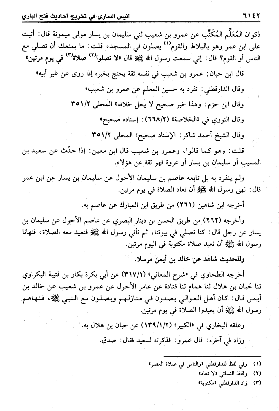 ولم ينفرد به بل تابعه عاصم بن سليمان الأحول عن سليمان بن يسار عن ابن عمر قال: نهى رسول الله -صلى الله عليه وسلم- أن تعاد الصلاة في يوم مرتين.