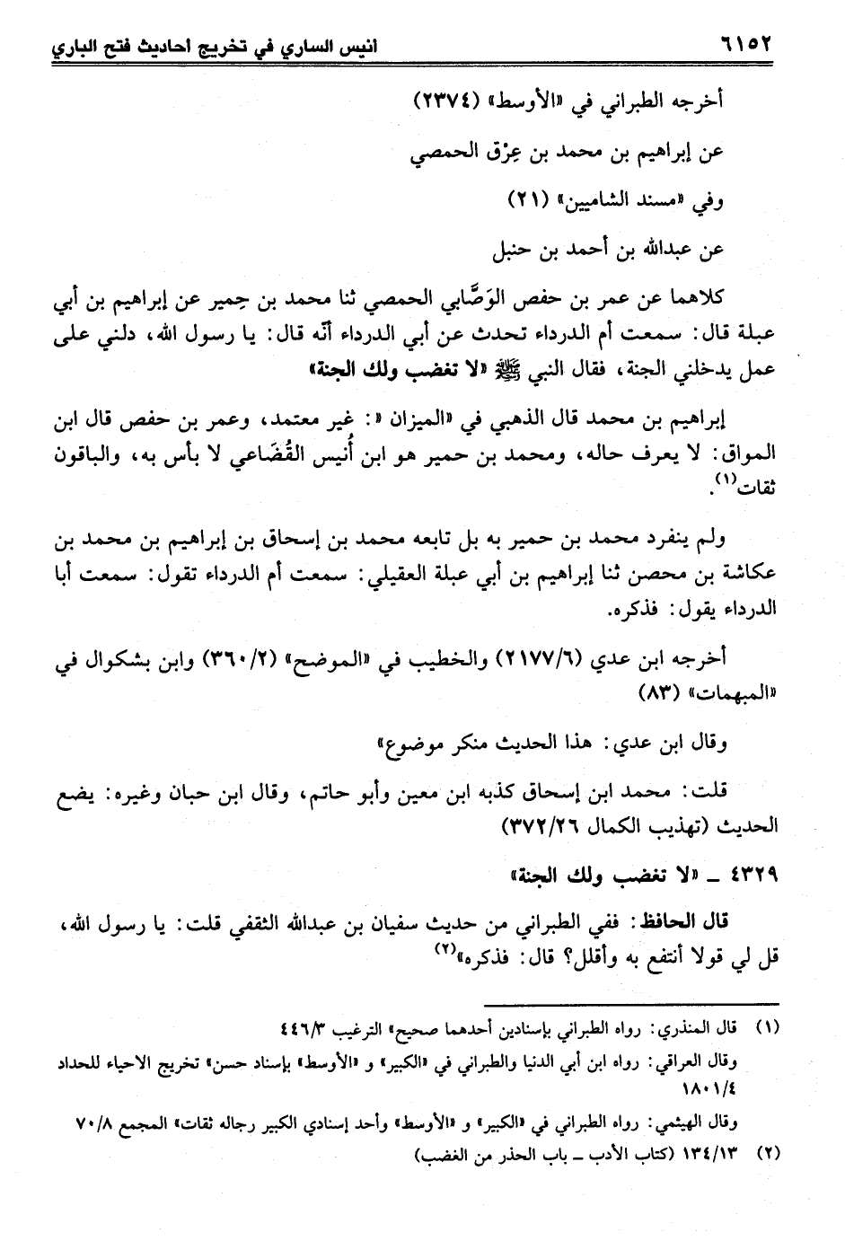 كلاهما عن عمر بن حفص الوَصَّابي الحمصي ثنا محمد بن حِمير عن إبراهيم بن أبي عبلة قال: سمعت أم الدرداء تحدث عن أبي الدرداء أنّه قال: يا رسول الله، دلني على عمل يدخلني الجنة، فقال النبي-صلى الله عليه وسلم- "لا تغضب ولك الجنة"