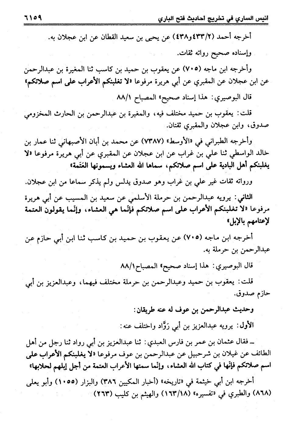 - فقال عثمان بن عمر بن فارس العبدي: ثنا عبد العزيز بن أبي رواد ثنا رجل من أهل الطائف عن غيلان بن شرحبيل عن عبد الرحمن بن عوف مرفوعا "لا يغلبنكم الأعراب على اسم صلاتكم فإنّها في كتاب الله العشاء، وإنّما سمتها الأعراب العتمة من أجل إبلهم لحلابها"