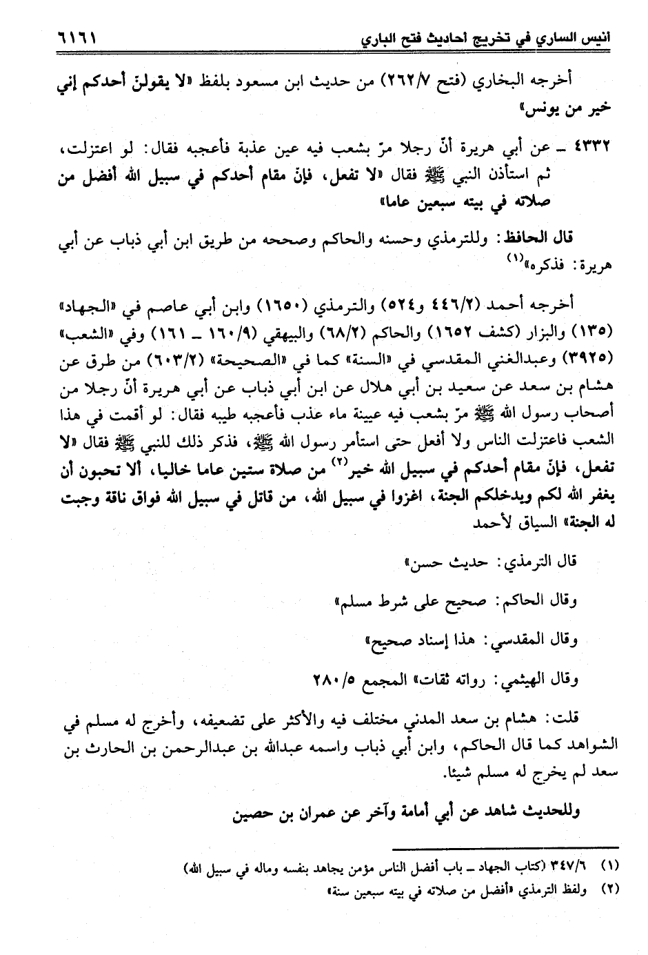 4332 - عن أبي هريرة أنّ رجلًا مرّ بشعب فيه عين عذبة فأعجبه فقال: لو اعتزلت، ثم استأذن النبي-صلى الله عليه وسلم- فقال "لا تفعل، فإنّ مقام أحدكم في سبيل الله أفضل من صلاته في بيته سبعين عامًا"