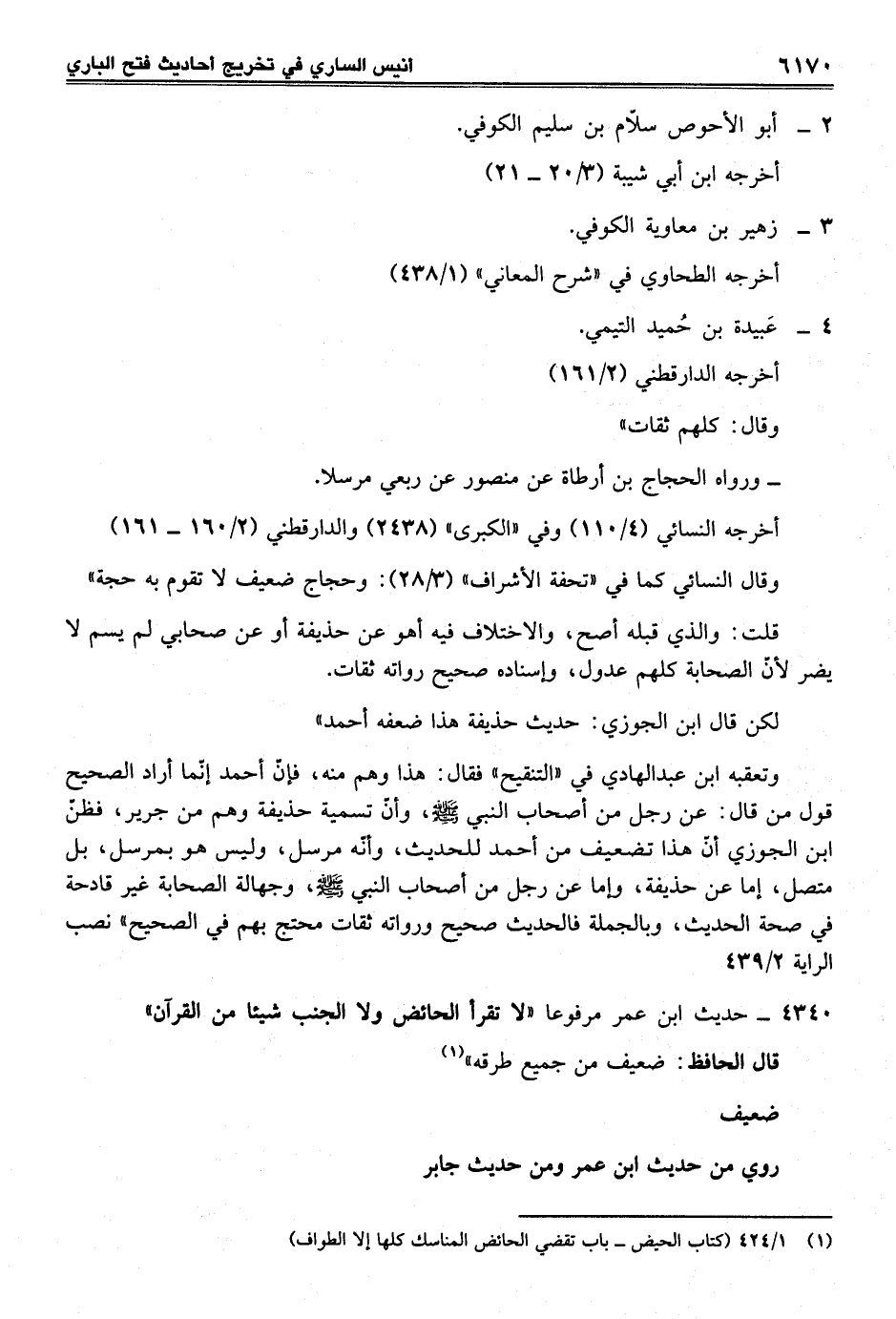 4340 - حديث ابن عمر مرفوعا "لا تقرأ الحائض ولا الجنب شيئًا من القرآن"