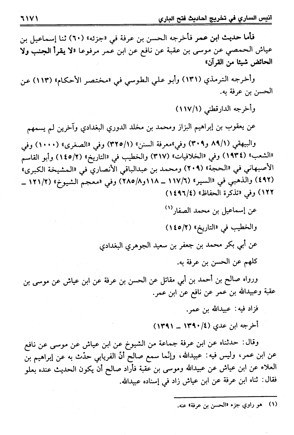 وقال: حدثناه عن ابن عرفة جماعة من الشيوخ عن ابن عياش عن موسى عن نافع عن ابن عمر، وليس فيه: عبيد الله، وإنّما سمع صالح أنّ الفريابي حدّث به عن إبراهيم بن العلاء عن ابن عياش عن عبيد الله وموسى بن عقبة فأراد صالح أن يكون الحديث عنده بعلو فقال: ثناه ابن عرفة عن ابن عياش زاد في إسناده عبيد الله.
