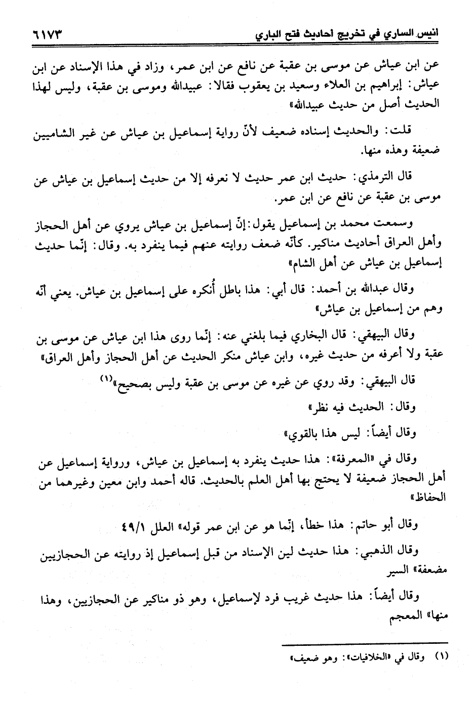 وسمعت محمد بن إسماعيل يقول: إنّ إسماعيل بن عياش يروي عن أهل الحجاز وأهل العراق أحاديث مناكير. كأنّه ضعف روايته عنهم فيما ينفرد به. وقال: إنّما حديث إسماعيل بن عياش عن أهل الشام"