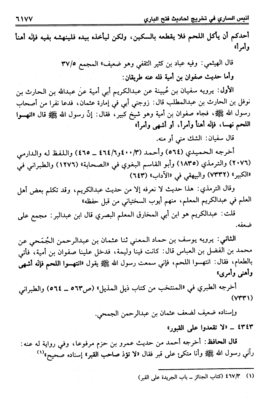 الثاني: يرويه يوسف بن حماد المعني ثنا عثمان بن عبد الرحمن الجُمَحى عن محمد بن الفضل بن العباس قال: كانت فينا وليمة، فدخل علينا صفوان بن أمية، فأتي بالطعام، فقال: انتهسوا اللحم، فإني سمعت رسول الله -صلى الله عليه وسلم- يقول "انتهسوا اللحم فإنه أشهى وأهنى وأمرى"