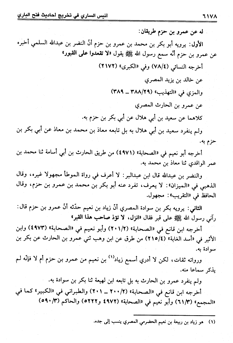الثاني: يرويه بكر بن سوادة المصري أنّ زياد بن نعيم حدّثه أنّ عمرو بن حزم قال: رآني رسول الله -صلى الله عليه وسلم- على قبر فقال "أنزل، لا تؤذ صاحب هذا القبر"