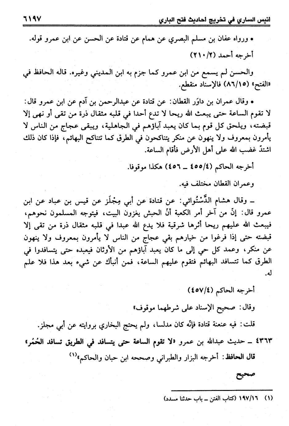 4363 - حديث عبد الله بن عمرو "لا تقوم الساعة حتى يتسافد في الطريق تسافد الحُمُر"