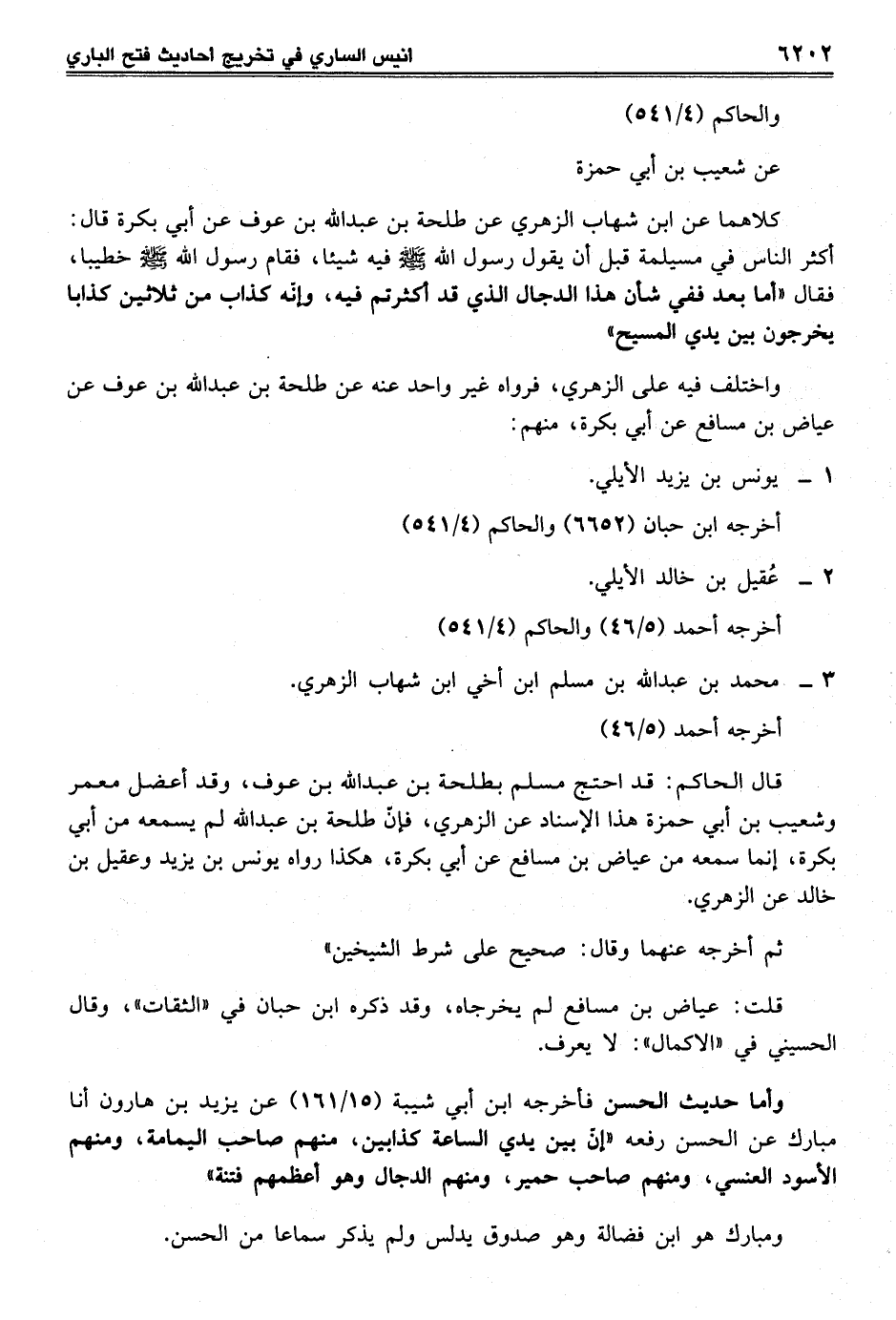 كلاهما عن ابن شهاب الزهري عن طلحة بن عبد الله بن عوف عن أبي بكرة قال: أكثر الناس في مسيلمة قبل أن يقول رسول الله -صلى الله عليه وسلم- فيه شيئًا، فقام رسول الله -صلى الله عليه وسلم- خطيبا، فقال "أما بعد ففي شأن هذا الدجال الذي قد أكثرتم فيه، وإنّه كذاب من ثلاثين كذابا يخرجون بين يدي المسيح"
