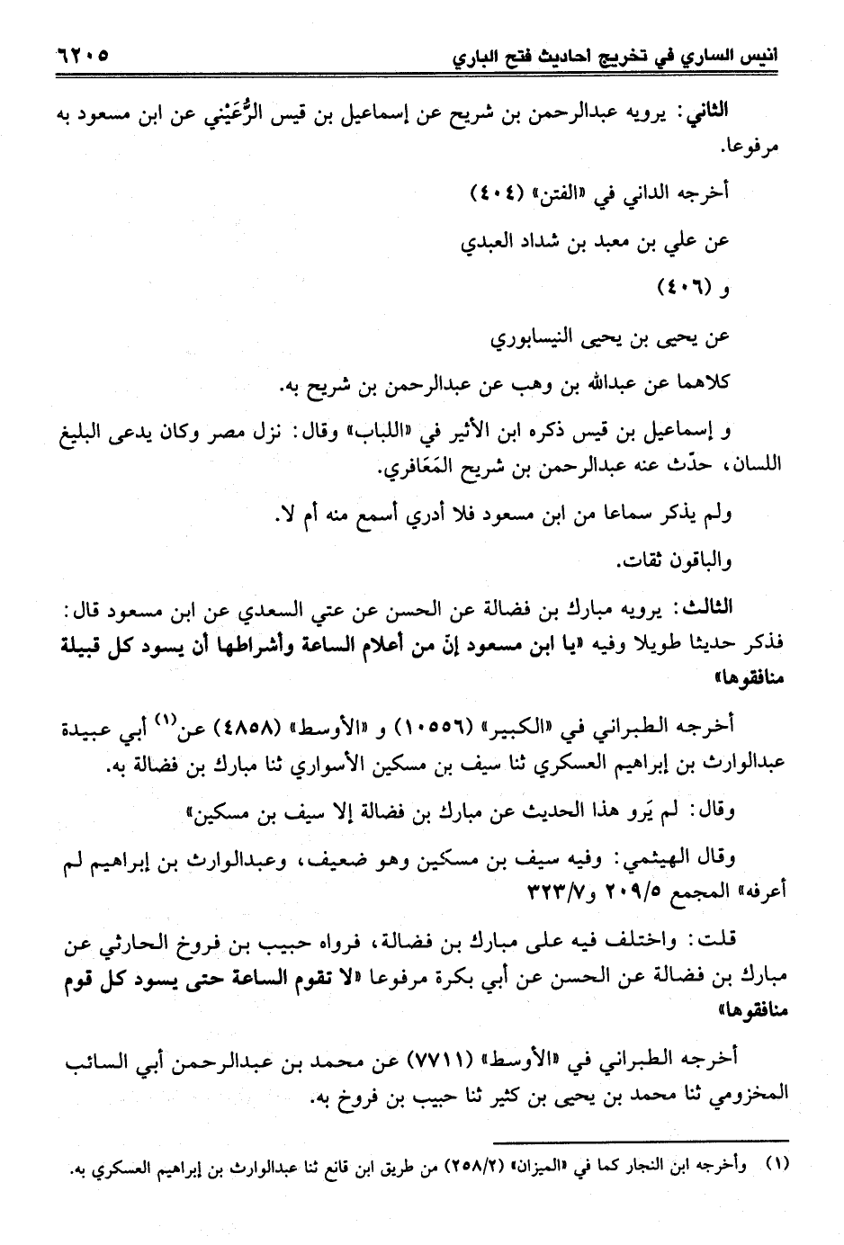 الثالث: يرويه مبارك بن فضالة عن الحسن عن عتي السعدي عن ابن مسعود قال: فذكر حديثا طويلًا وفيه "يا ابن مسعود إنّ من أعلام الساعة وأشراطها أن يسود كل قبيلة منافقوها"