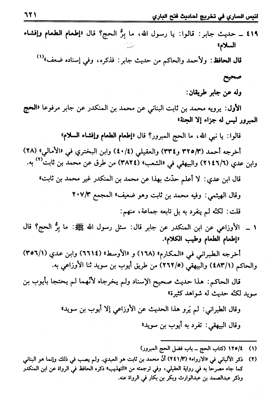 1 - الأوزاعي عن ابن المنكدر عن جابر قال: سئل رسول الله - صلى الله عليه وسلم -: ما بِرُّ الحج؟ قال "إطعام الطعام وطيب الكلام".