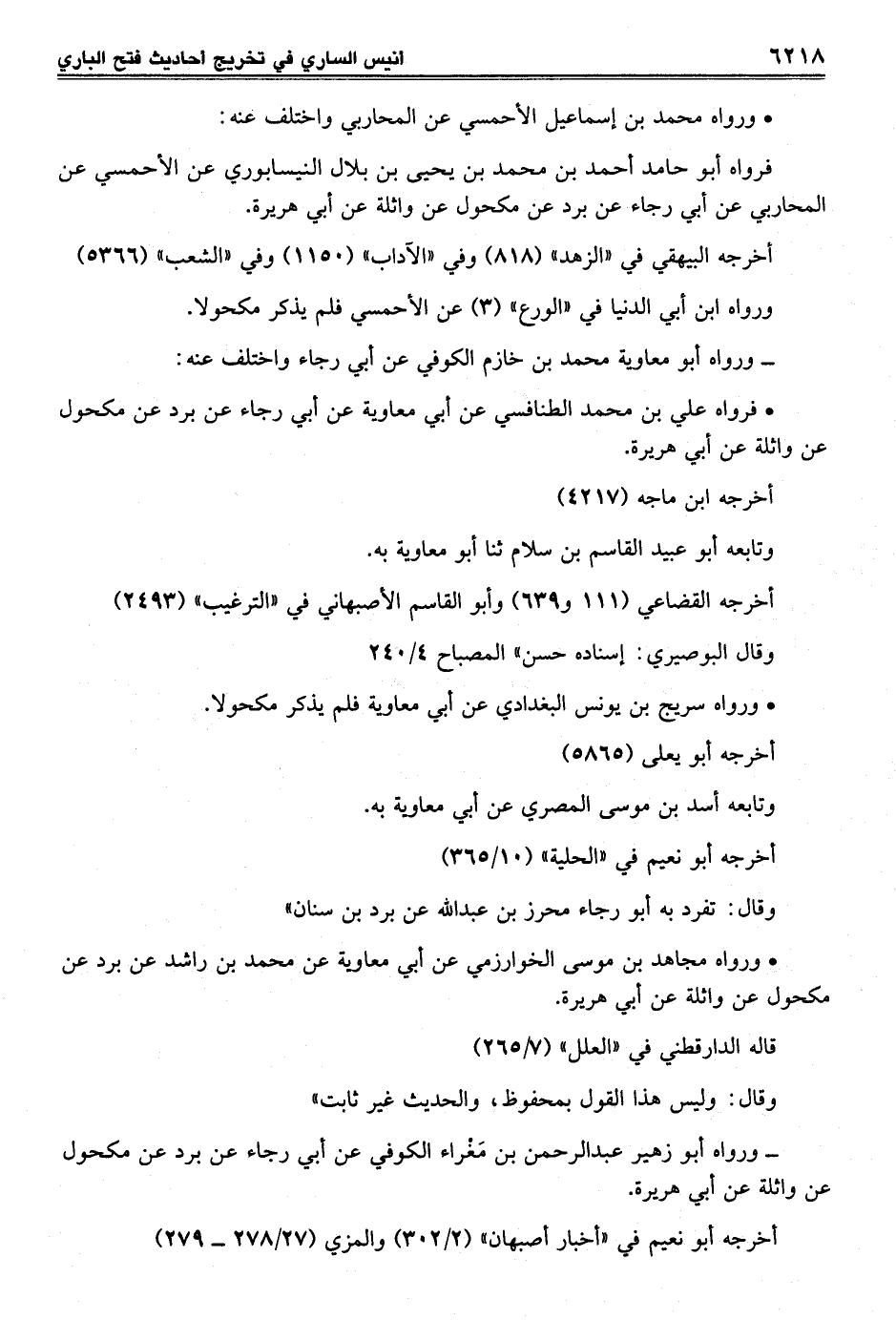 • فرواه علي بن محمد الطنافسى عن أبي معاوية عن أبي رجاء عن برد عن مكحول عن واثلة عن أبي هريرة.