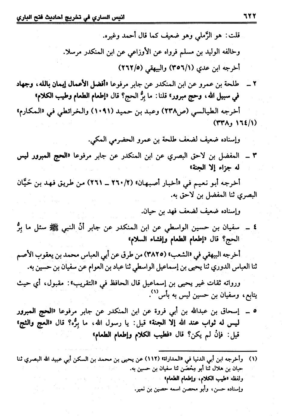 2 - طلحة بن عمرو عن ابن المنكدر عن جابر مرفوعا "أفضل الأعمال إيمان بالله، وجهاد في سبيل الله، وحج مبرور" قلنا: ما بِرُّ الحج؟ قال "إطعام الطعام وطيب الكلام"