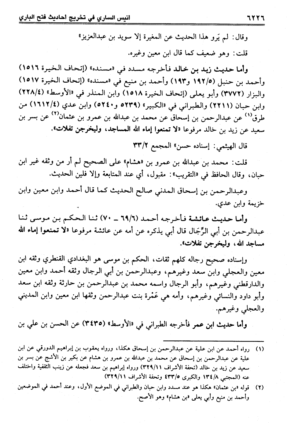 (¬1) رواه أحمد عن ابن علية عن عبد الرحمن بن إسحاق هكذا، ورواه يعقوب بن إبراهيم الدورقي عن ابن علية عن عبد الرحمن بن إسحاق عن محمد بن عبد الله بن عمرو بن هشام عن بكير بن الأشج عن بسر بن سعيد عن زيد بن خالد (تحفة الأشراف 11/ 329) ورواه إبراهيم بن سعد فجعله عن زينب الثقفية واختلف عنه (المجتبي 8/ 134 والكبرى 5/ 433 وتحفة الأشراف 11/ 329)