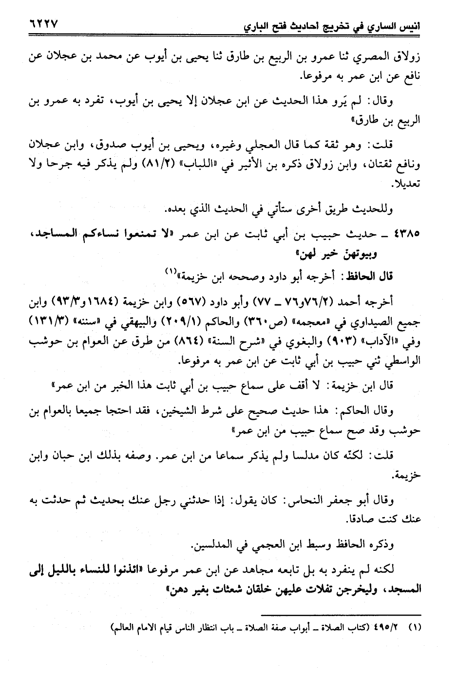 4385 - حديث حبيب بن أبي ثابت عن ابن عمر "لا تمنعوا نساءكم المساجد، وبيوتهنّ خير لهن"