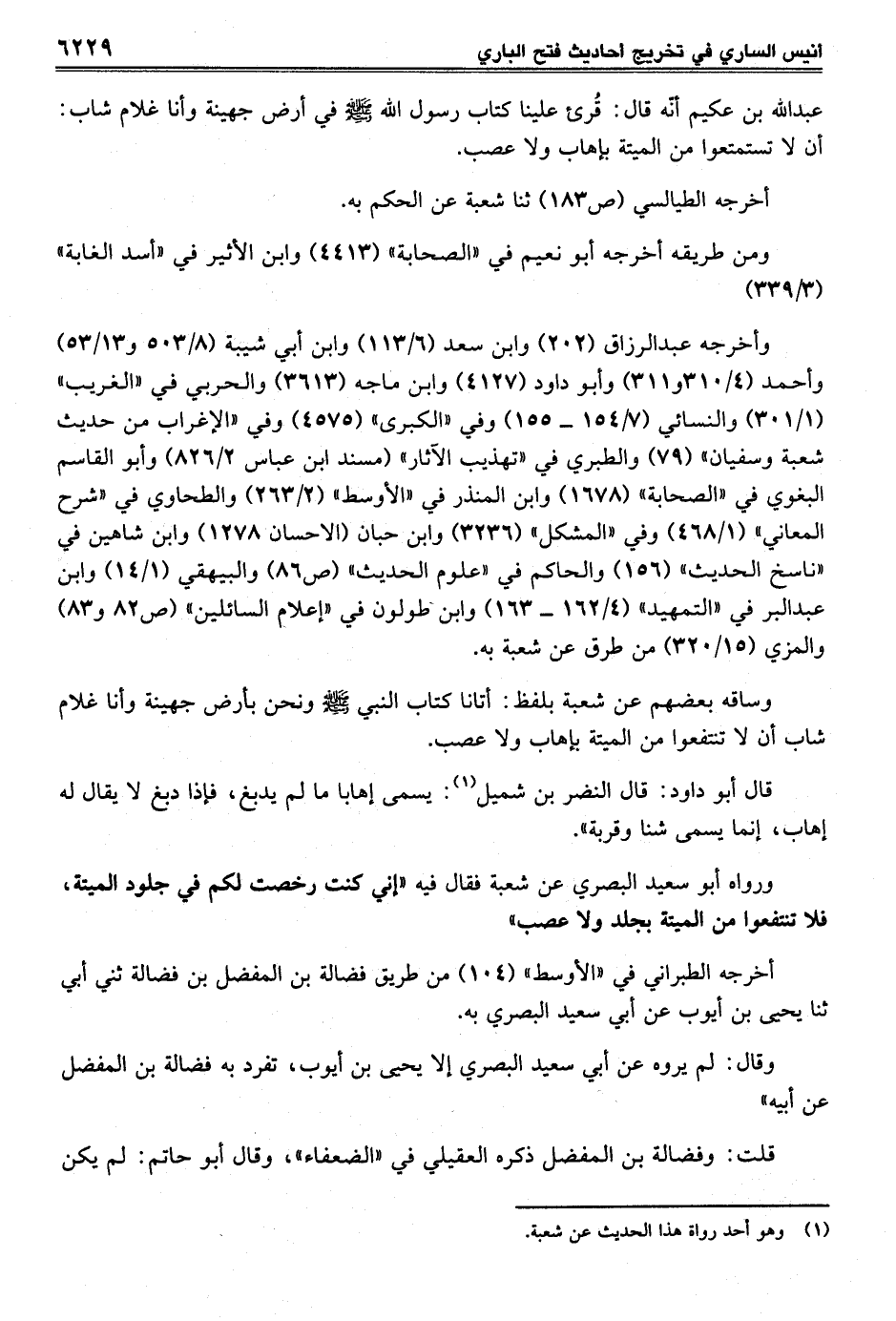 عبد الله بن عكيم أنّه قال: قُرئ علينا كتاب رسول الله -صلى الله عليه وسلم- في أرض جهينة وأنا غلام شاب: أن لا تستمتعوا من الميتة بإهاب ولا عصب.