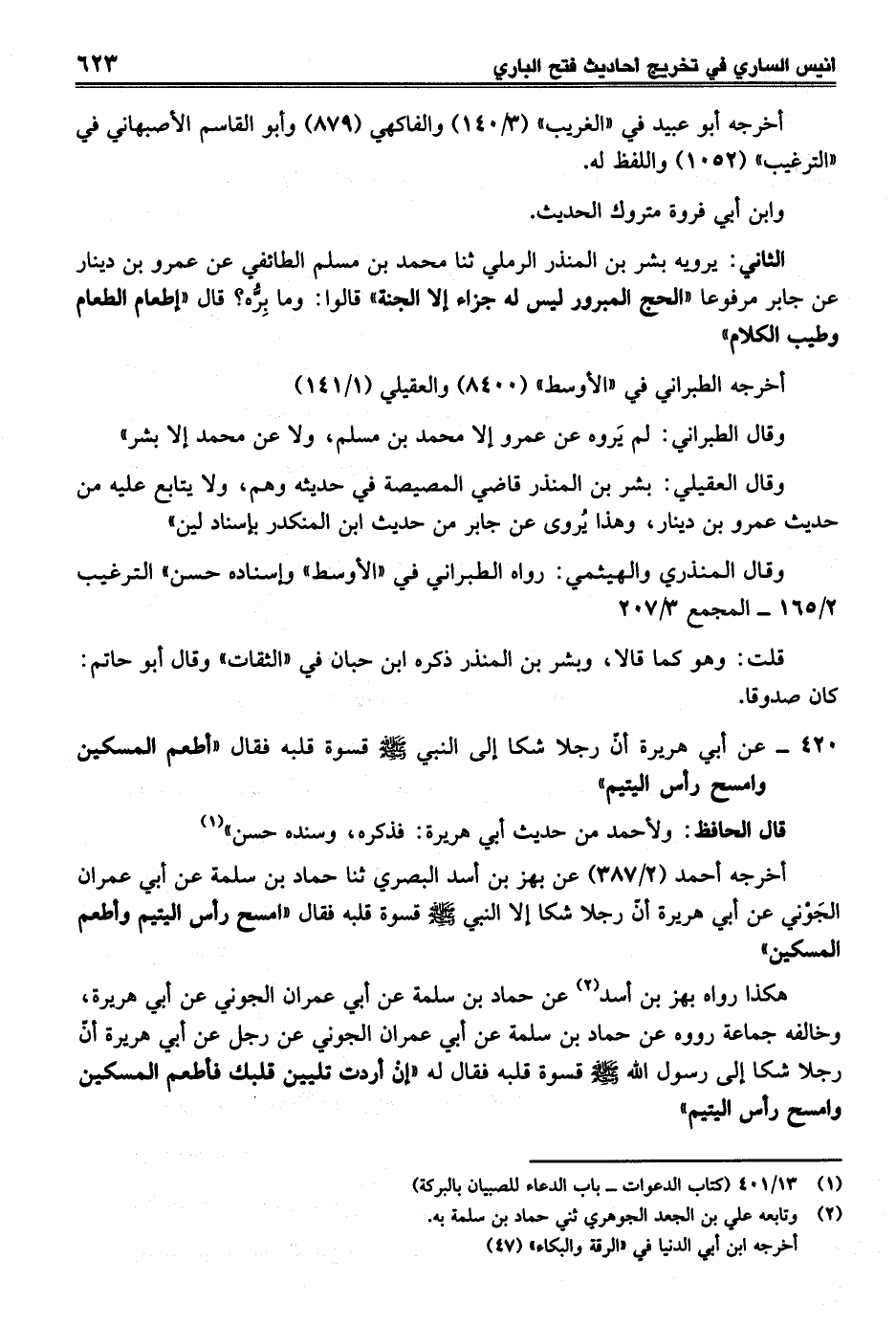 هكذا رواه بهز بن أسد (¬2) عن حماد بن سلمة عن أبي عمران الجوني عن أبي هريرة، وخالفه جماعة رووه عن حماد بن سلمة عن أبي عمران الجوني عن رجل عن أبي هريرة أنّ رجلا شكا إلى رسول الله - صلى الله عليه وسلم - قسوة قلبه فقال له "إن أردت تليين قلبك فأطعم المسكين وامسح رأس اليتيم"