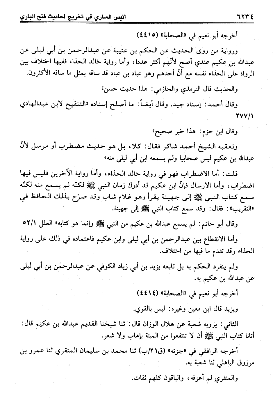 ورواية من روى الحديث عن الحكم بن عتيبة عن عبد الرحمن بن أبي ليلى عن عبد الله بن عكيم عندي أصح لأنّهم أكثر عددا، وأما رواية خالد الحذاء ففيها اختلاف بين الرواة على الحذاء نفسه مع أنّ أحدهم وهو عباد بن عباد قد ساقه بمثل ما ساقه الأكثرون.
