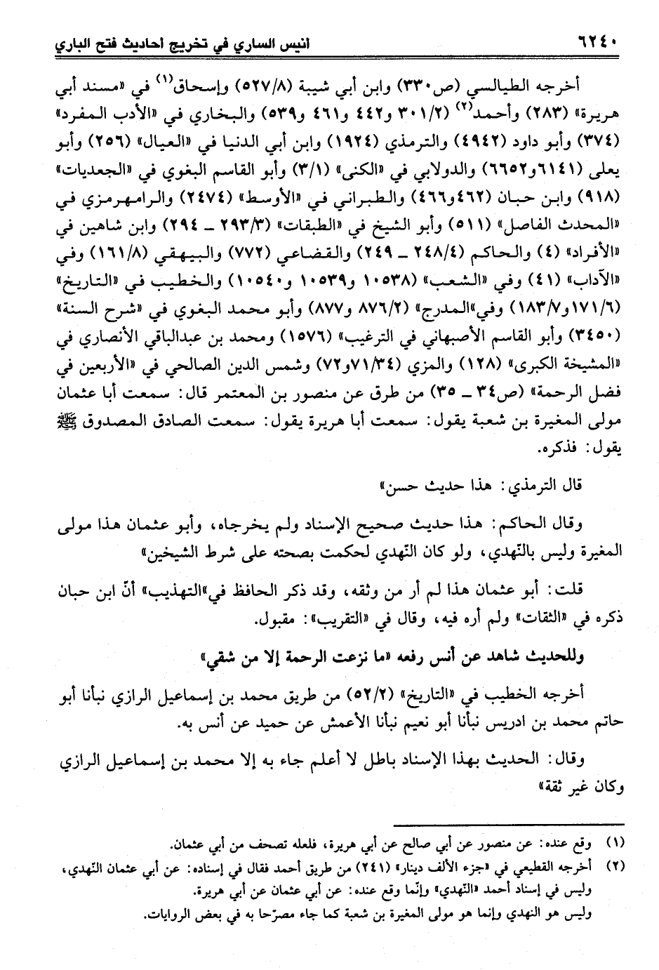 وقال الحاكم: هذا حديث صحيح الإسناد ولم يخرجاه، وأبو عثمان هذا مولى المغيرة وليس بالنهدي، ولو كان النّهدي لحكمت بصحته على شرط الشيخين"