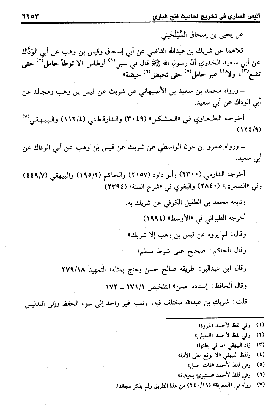 كلاهما عن شريك بن عبد الله القاضي عن أبي إسحاق وقيل بن وهب عن أبي الوَدَّاك عن أبي سعيد الخدري أنّ رسول الله -صلى الله عليه وسلم- قال في سبي (¬1) أوطاس "لا توطأ حامل (¬2) حتى تضع (¬3)، ولا (¬4) غير حامل (¬5) حتى تحيض (¬6) حيضة"