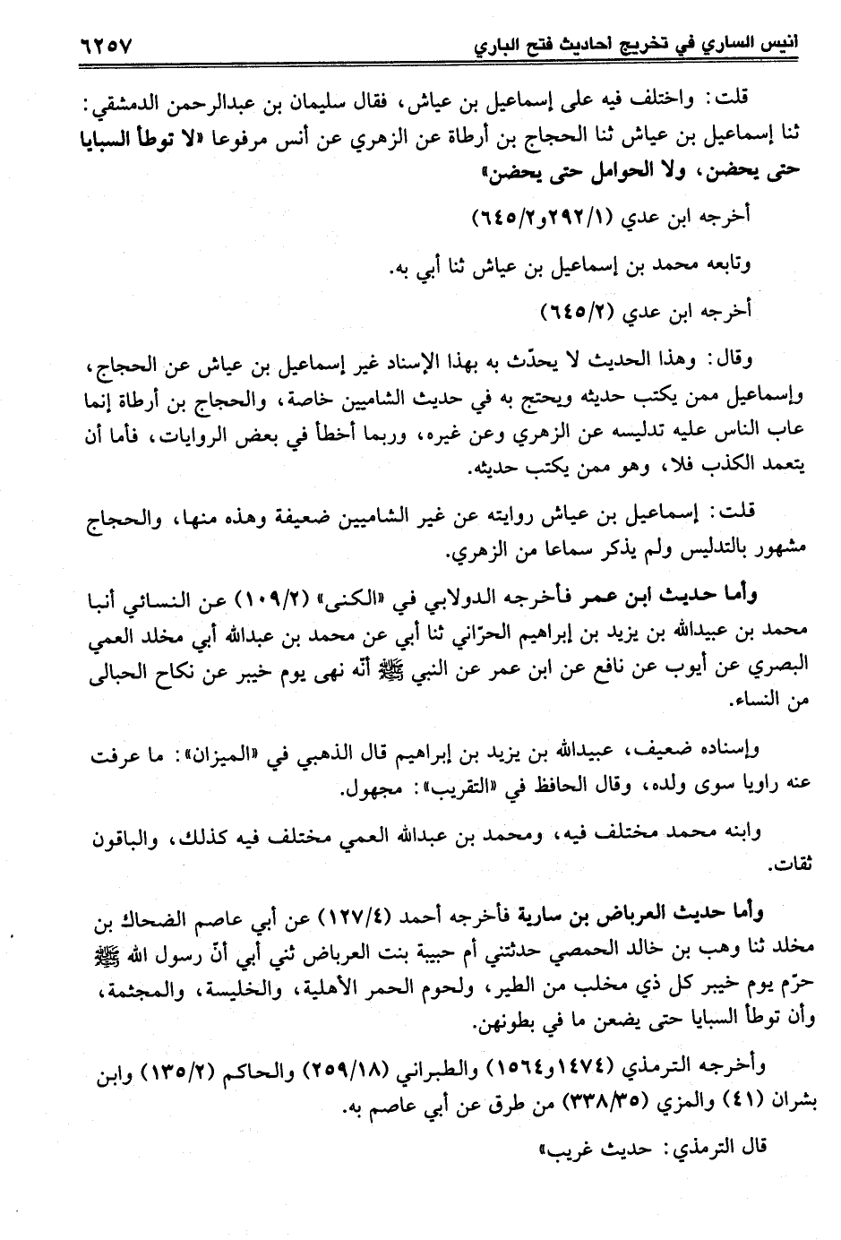 قلت: واختلف فيه على إسماعيل بن عياش، فقال سليمان بن عبد الرحمن الدمشقي: ثنا إسماعيل بن عياش ثنا الحجاج بن أرطأة عن الزهري عن أنس مرفوعا "لا توطأ السبايا حتى يحضن، ولا الحوامل حتى يحضن"